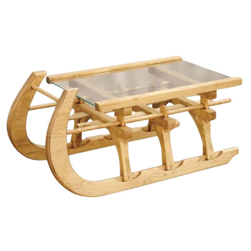 Table basse luge en sapin massif avec plateau en verre